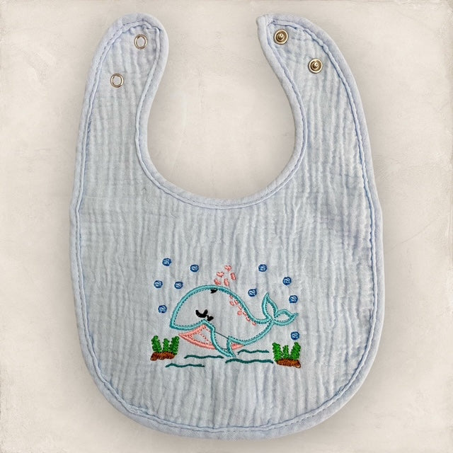 Care instructions: Machine wash on a delicate setting. Air dry to preserve the bib's softness and longevity