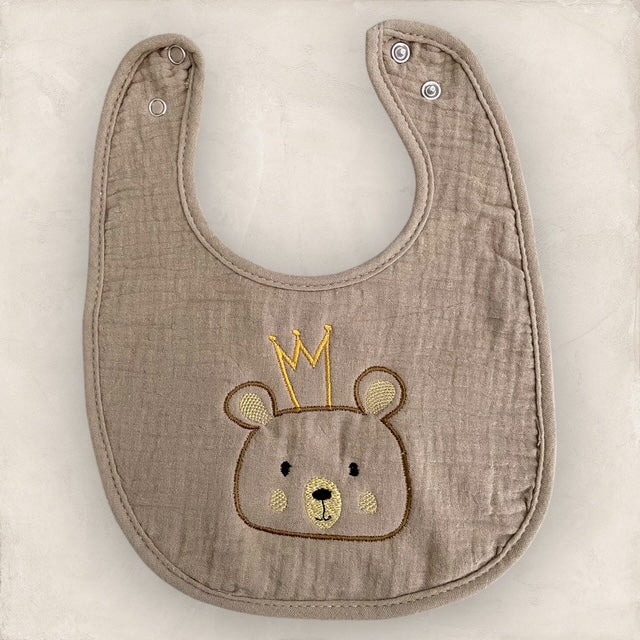 A baby bib is made from gentle muslin. Snap closure at the neck ensures a secure and comfortable fit. The bib color is a shade of brown.