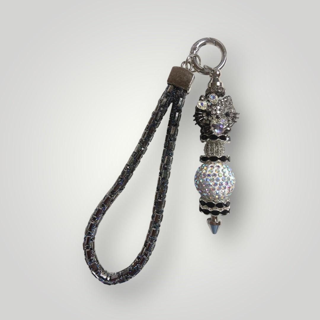 Blingy Beaded Wristlet Keychain - Gunmetal with Rhinestone Kitty