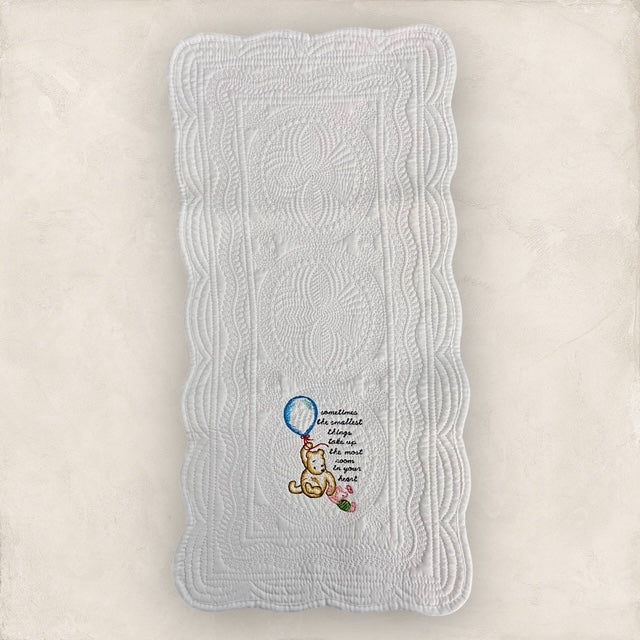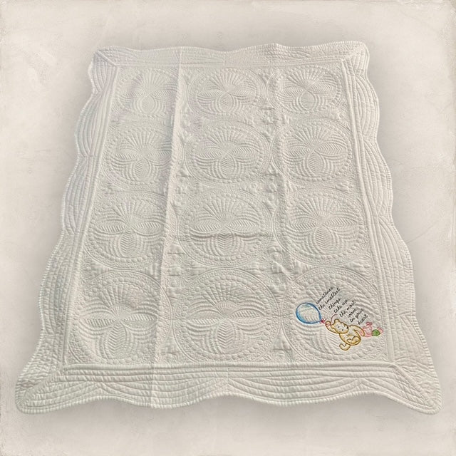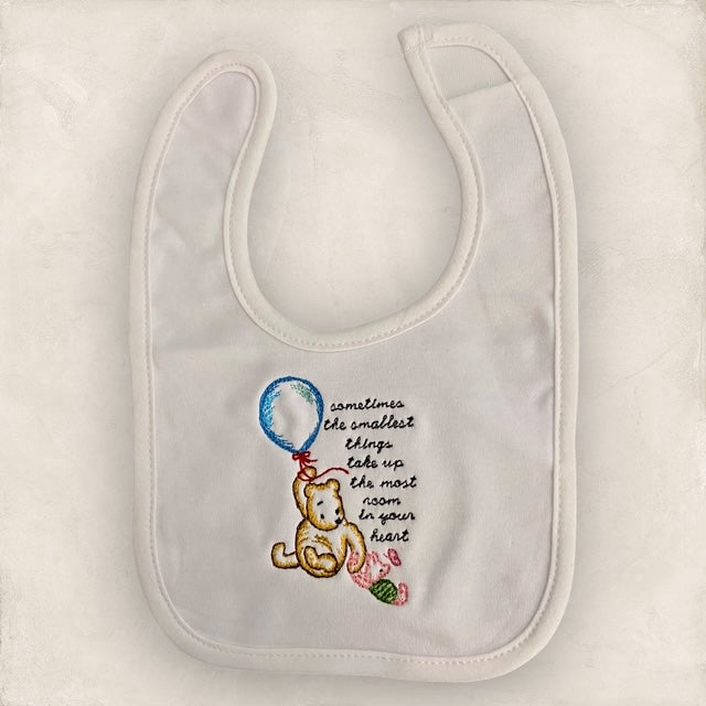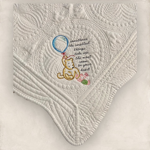 Classic Pooh and Piglet embroidered design on an heirloom quilt. Text reads: "sometimes the smallest things take up the most room in your heart."