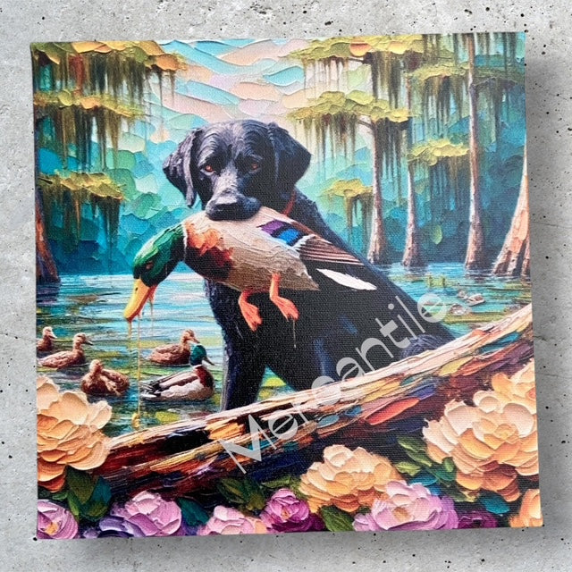 This impasto-style canvas print showcases a retriever and ducks. An AI generated design.