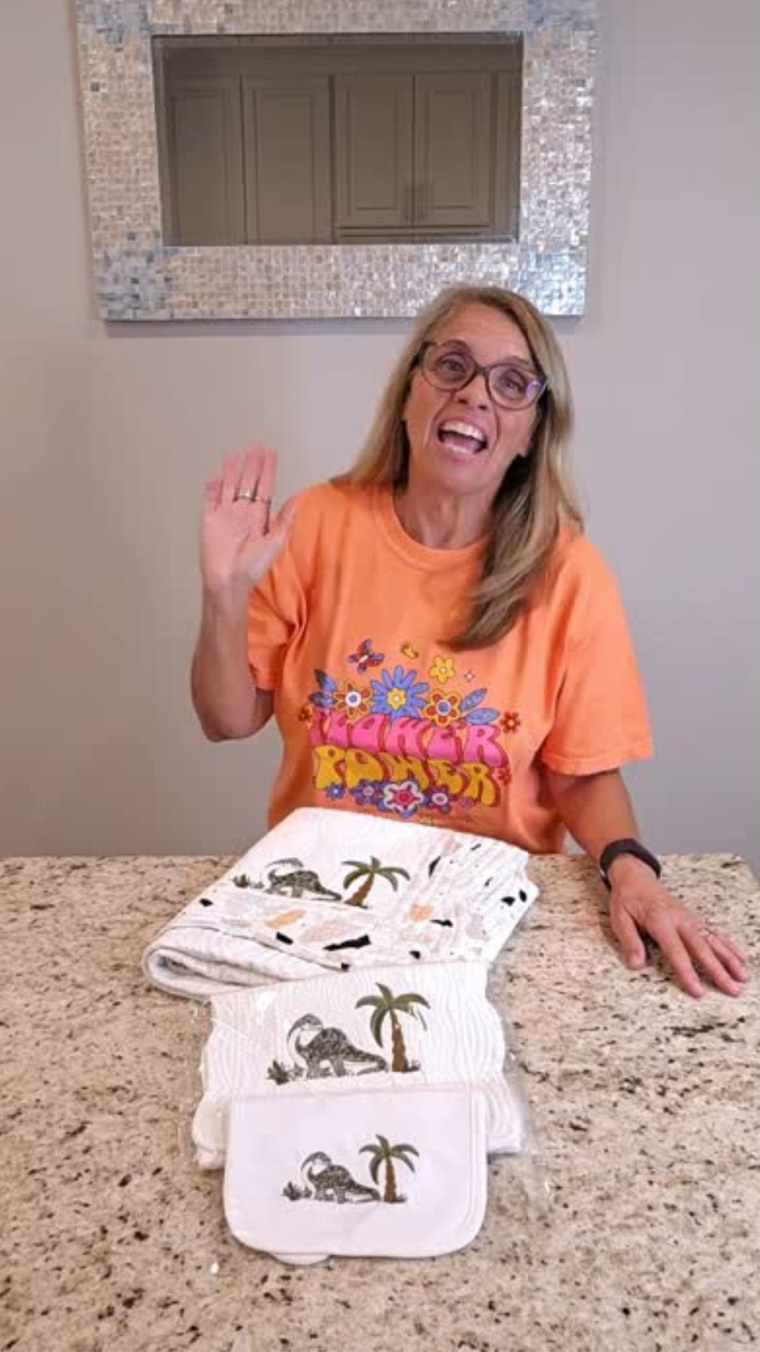 Dinosaur embroidered design on an heirloom quilt.