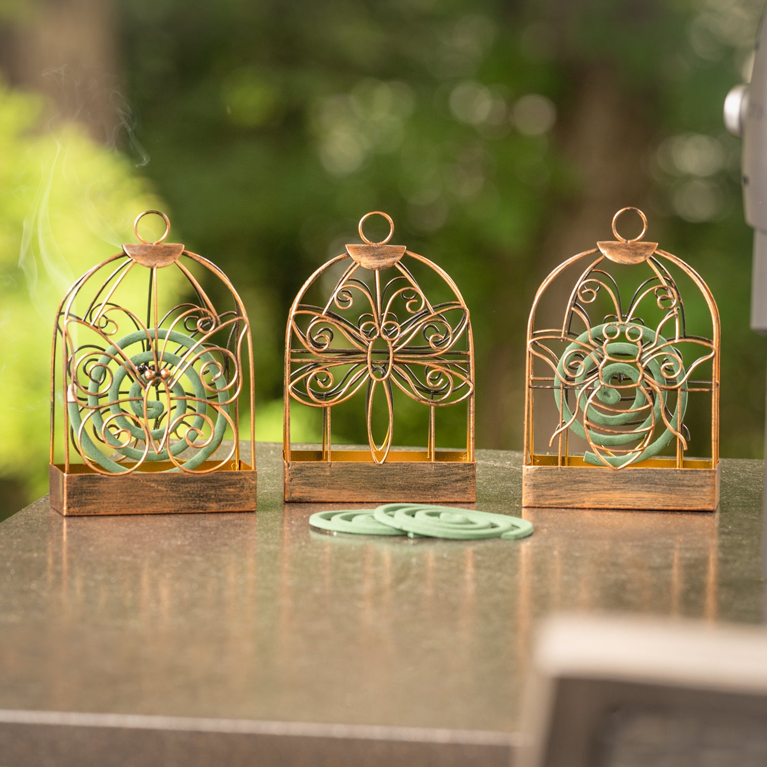 Keep insects at bay with our pest-repellant solutions that offer an attractive accent for outdoor tables, patio furniture, and more. This program of metal citronella coil holders includes an assortment of a butterfly, dragonfly, and bee design. The coil that emits an enjoyable citronella scent, repelling bugs and mosquitoes.