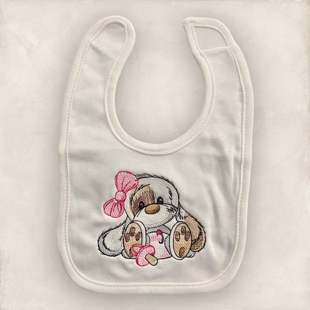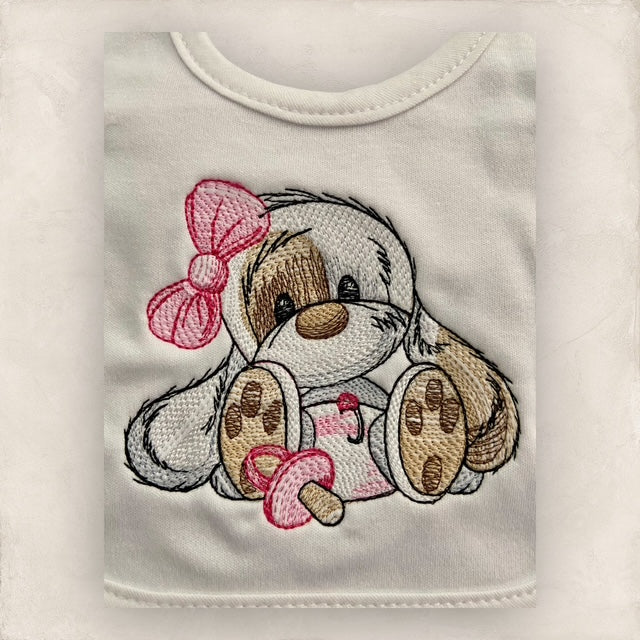 Long-eared puppy embroidered design on an heirloom quilt.