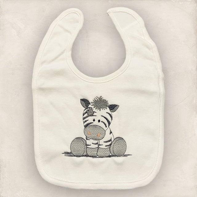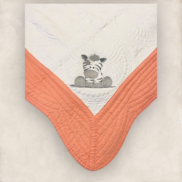 A "patched" Zebra embroidered design on an heirloom quilt is a timeless and nostalgic motif, evoking the charm of childhood past. The embroidery features a "patched" Zebra. The quilt itself is white and has a scalloped coral edge, further enhancing its heirloom appeal. In shades of coral, black, white and gray. This 2-piece set includes the heirloom quilt and bib.