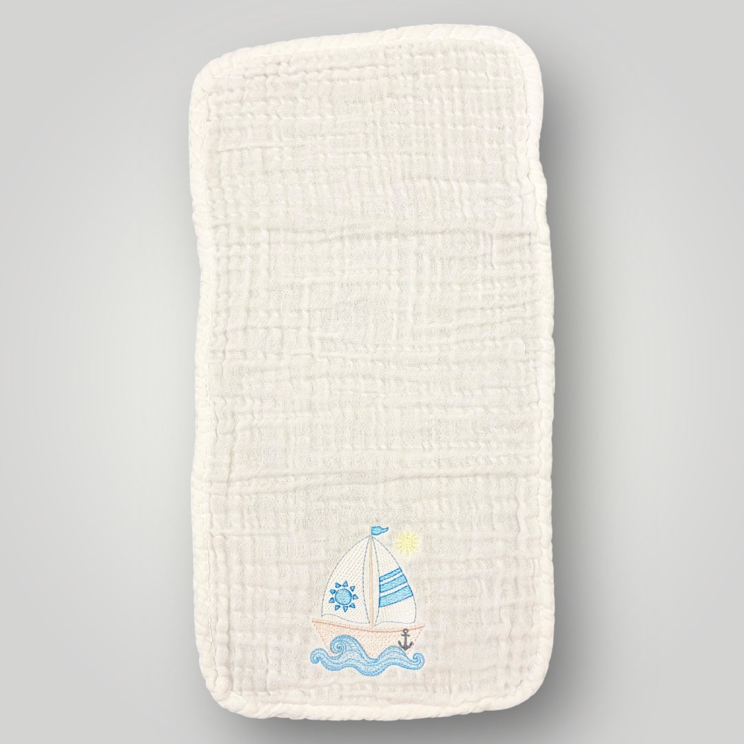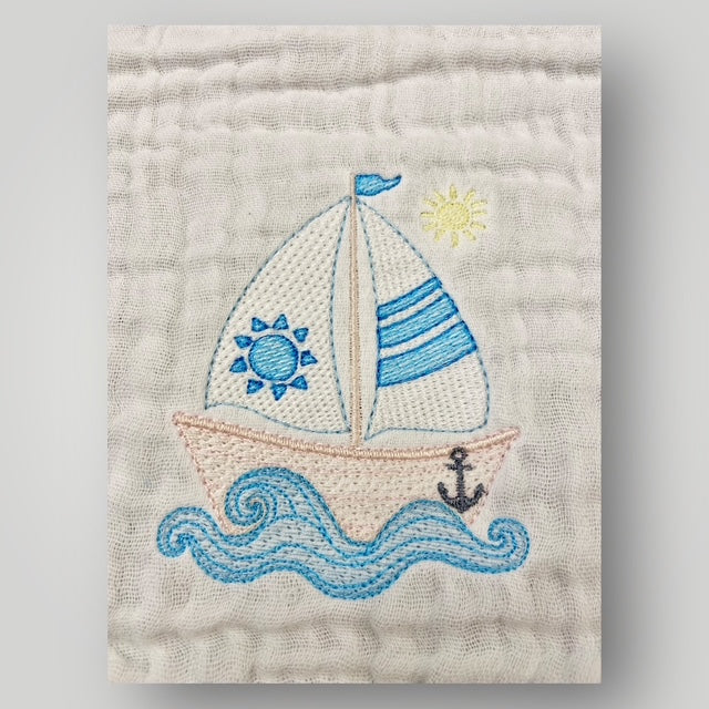 Soft muslin burp cloth. Charming pink sailboat gently bobbing on soft, rolling waves. The boat is painted a pale pink with a crisp white sail that billows in the breeze. A smaller, second sail adds a touch of whimsey - patterned with stripes of light blue. Above, the sun glows warmly.