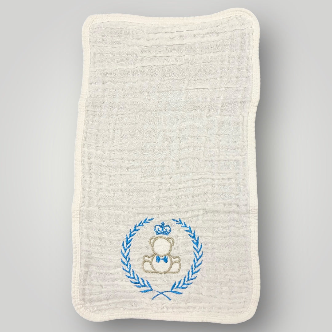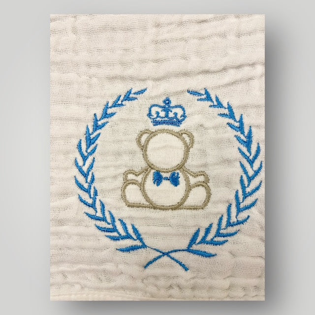 Soft muslin burp cloth. Elegant design of a taupe-colored bear with blue bow. Perched above its head is a tiny blue crown. Surrounding the bear is a graceful laurel wreath--stylized leaves in blue. The whole design feels classic and noble, like a tiny crest fit for a royal nursery.
