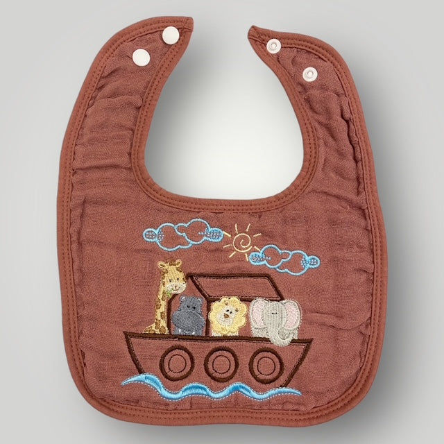 A boho baby bib featuring a Noah's Ark with animals in various shades of golden yellow, blues, grays, browns. Made from gentle muslin. Snap closure at the neck ensures a secure and comfortable fit. The bib color is like a mulberry.