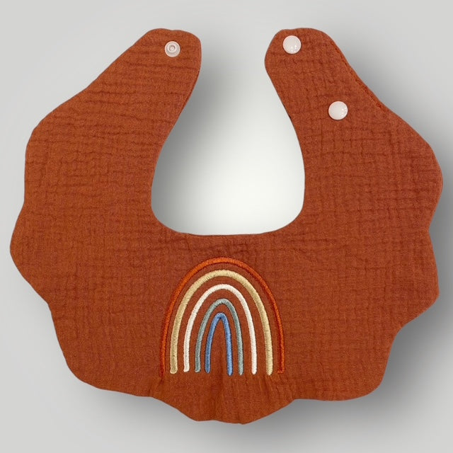 A scalloped boho baby bib featuring a rainbow in various shades of blue, teal, rust, gold and beige. Made from gentle muslin. Snap closure at the neck ensures a secure and comfortable fit. The bib color is like a burnt brick.