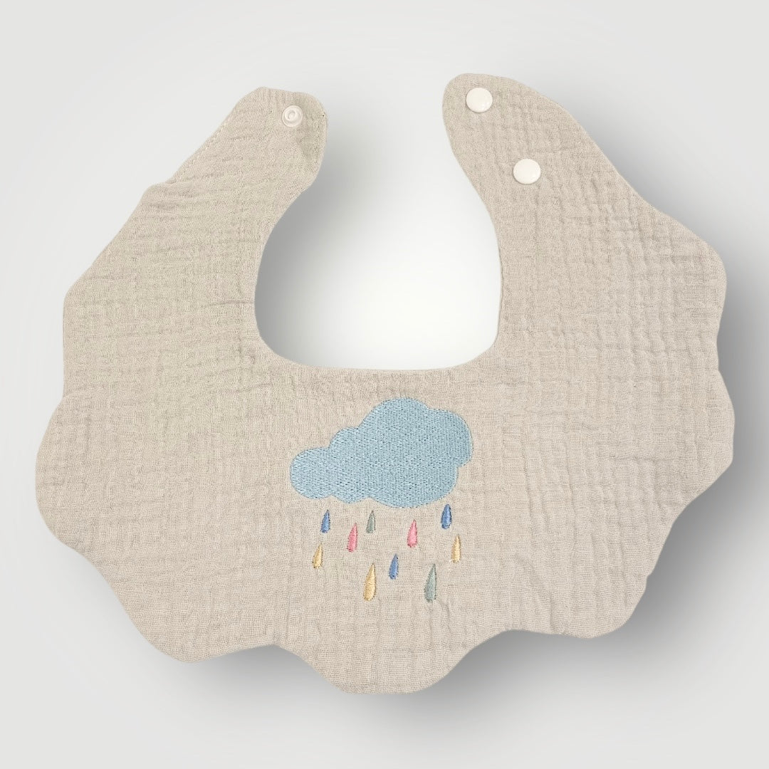 A scalloped boho baby bib featuring a cloud and raindrops varying in various shades of blue, pink, gold and green. Made from gentle muslin. Snap closure at the neck ensures a secure and comfortable fit. The bib color is like a soft stone gray.