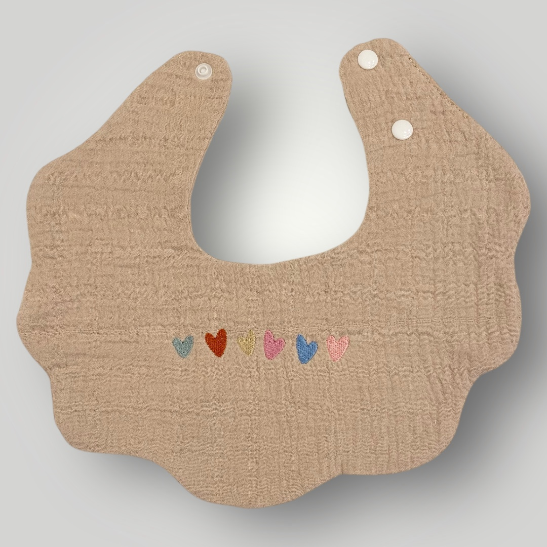 A scalloped boho baby bib featuring hearts varying in various shades of teal, pink, rust, yellow and coral. Made from gentle muslin. Snap closure at the neck ensures a secure and comfortable fit. The bib color is like a soft beige tone.