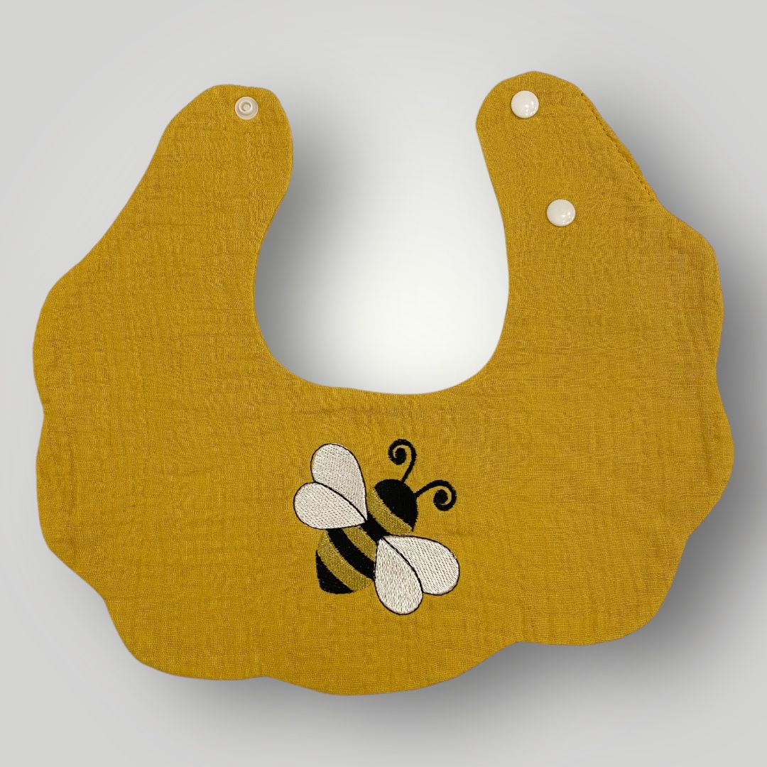 A scalloped boho baby bib featuring a bumblebee in various shades of golden yellow, white and black. Made from gentle muslin. Snap closure at the neck ensures a secure and comfortable fit. The bib color is like a mustard gold.