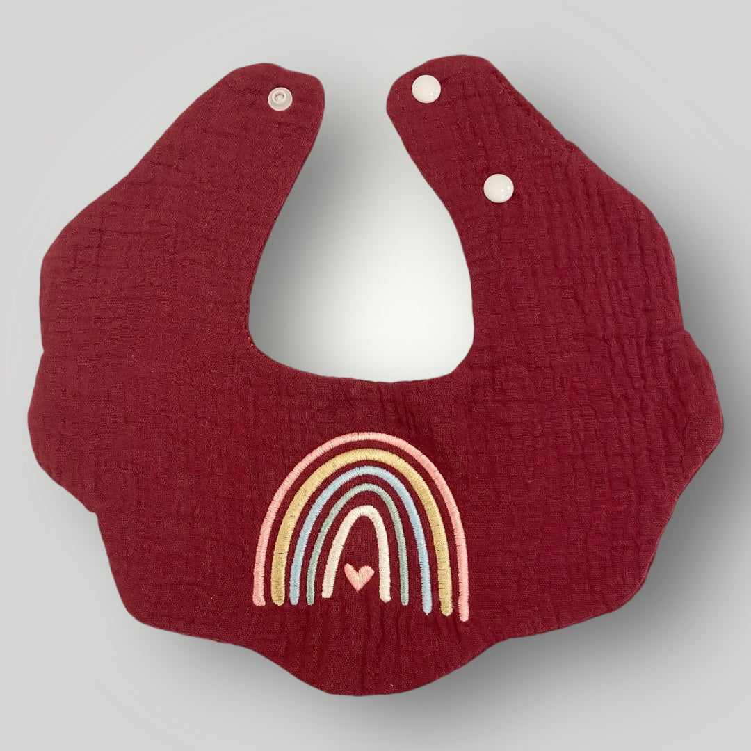A scalloped boho baby bib featuring a rainbow with a heart in various shades of blue, teal, pink, gold and beige. Made from gentle muslin. Snap closure at the neck ensures a secure and comfortable fit. The bib color is like wine.