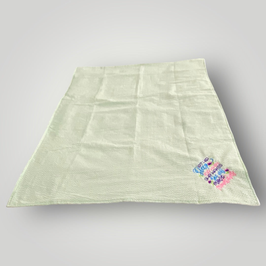 A Minky blanket made for sweet dreams and big futures--striped seersucker fabric on one side and white Minky dot on the other. Embroidered delicately are the words: