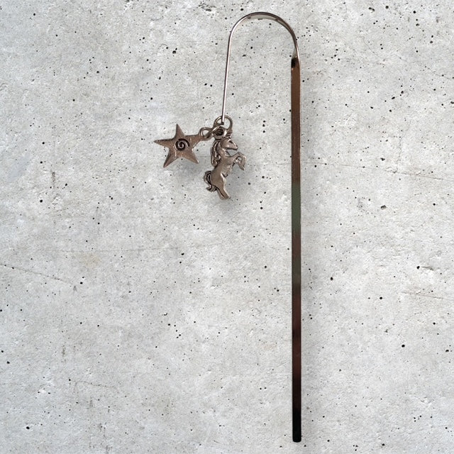 This adorable bookmark is the perfect finishing touch for your favorite book, presents, party favors, or place setting markers. Features a pewter Unicorn and Star charm Approx. 5.5 "tall with a steel shaft that won't bend