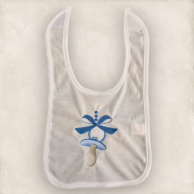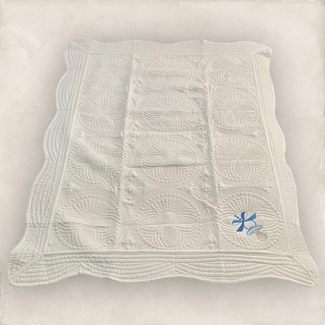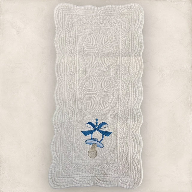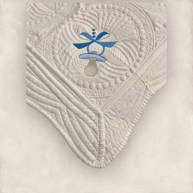 A Tetine Bleu (Blue pacifier) embroidered design on an heirloom quilt.