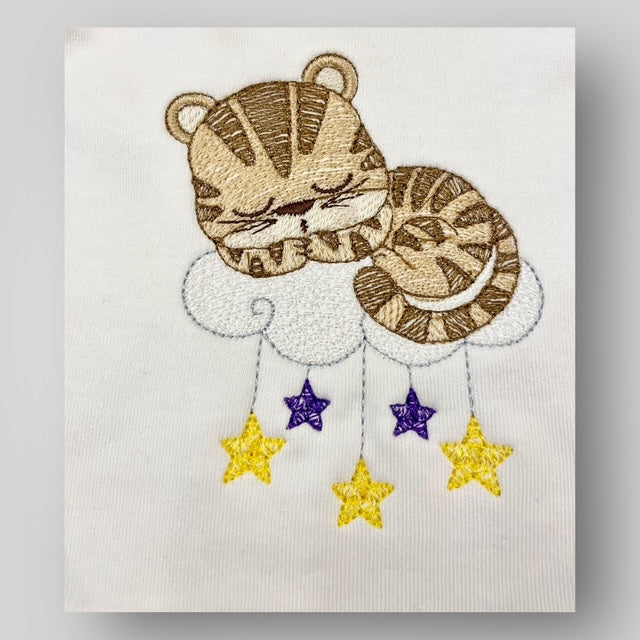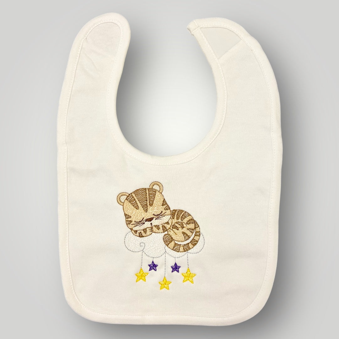 Soft cotton bib with a cozy rounded neckline and snap closure. Tiny tiger cub curled up peacefully on a fluffy white cloud, its little body nestled into the softness like it's floating in a dreamy sky. Dangling from the edges of the cloud are delicate strings with tiny stars--some shimmering gold and others a dreamy purple.