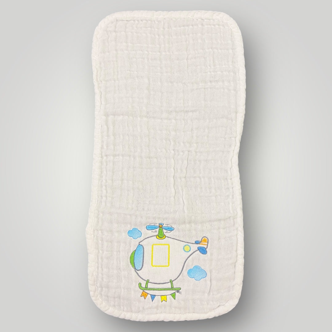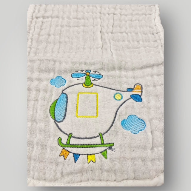 Soft muslin burp cloth. The adorable helicopter is surrounded by clouds giving it a whimsical look.