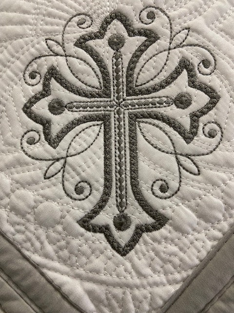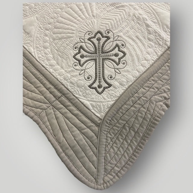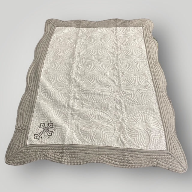 An heirloom baby quilt designed for a Baptism or Christening is a delicate and timeless piece, crafted with love and care. The embroidery features an elegant cross with motifs. The quilt itself is white and has a gray scalloped edge, further enhancing its heirloom appeal. The design is in a shade of gray.