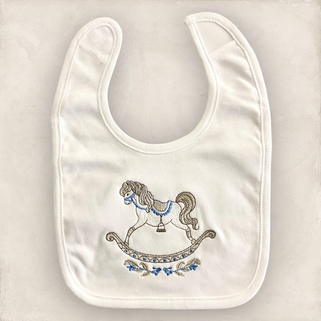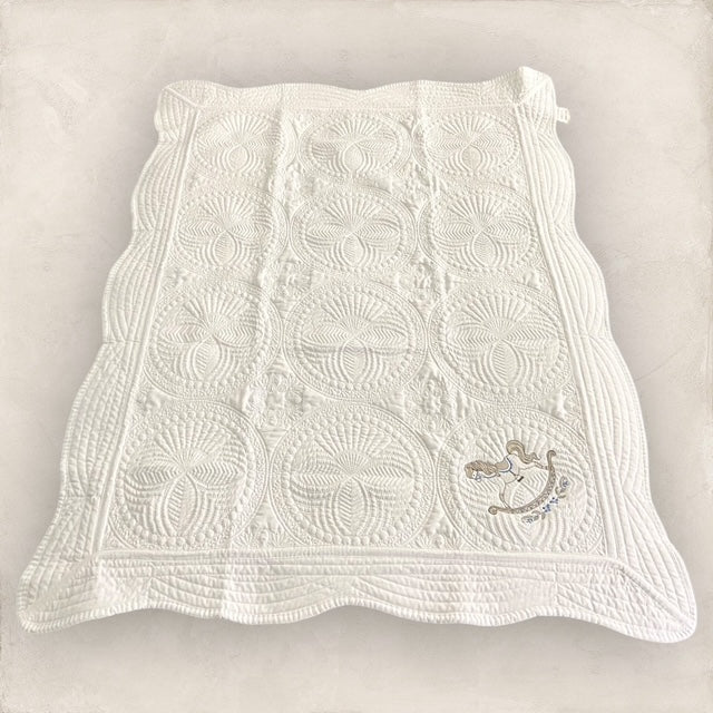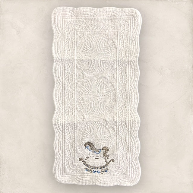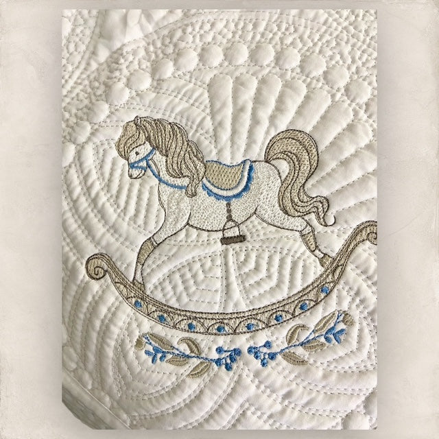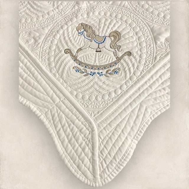 A vintage rocking horse embroidered design on an heirloom quilt is a timeless and nostalgic motif, evoking the charm of childhood past. The embroidery features a classic wooden rocking horse with gracefully curved rockers and ornate details. The quilt itself is white and has a scalloped edge, further enhancing its heirloom appeal. In shades of taupe, blue and white.